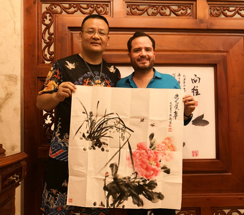 徐旭昶会长赠送牡丹图给梅里达旅游局长与商务局长