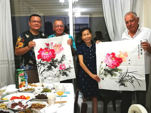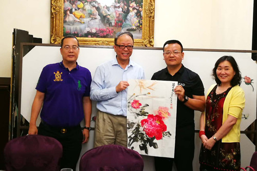 徐旭昶赠送亲自绘制的牡丹图并与当地侨领合影