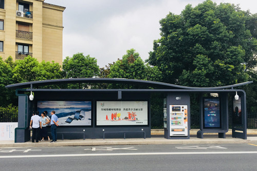 候车亭的左侧设置了一台可以采用线上支付方式的自动贩卖机,可以通过它买到各种饮料、夏日炎炎,冰饮解暑,并设置有专门的无线网络为乘客提供便利。同时设有电子预报站系统,LCD高亮度触屏显示器,等车时也可享受ipad带来的搜索体验。候车亭设有USB接口,任何时间地点,不用再担心手机没电带来的困扰。