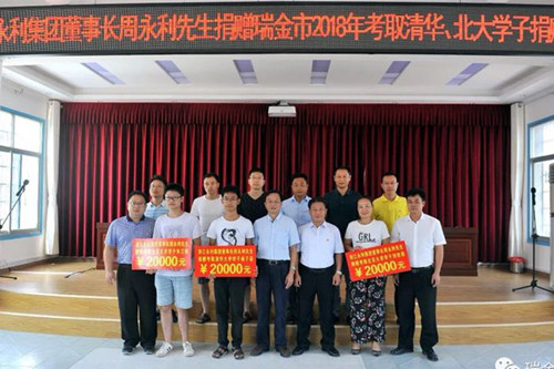 最近,绍兴市柯桥区侨商会永远名誉会长、浙江永利集团董事长周永利先生捐赠江西瑞金市2018年考取清华、北大学子助学款仪式在江西瑞金市教育局举行。浙江永利集团代表杨晓宁先生出席仪式并讲话,瑞金市教育局党委书记、局长刘福安致辞,市教育局副局长黄迎春主持。市教育局机关干部、瑞金一中、瑞金二中、瑞金三中校长,今年考取清华、北大学子所在年级班主任及今年考取清华、北大的学子和家长参加了捐赠仪式。三位今年考上清华、北大学子现场收到永利集团捐助的每人2万元助学金。