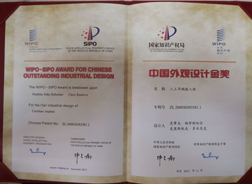 12月15日,由中国国家知识产权局和世界知识产权组织共同主办的第十七届中国专利奖颁奖大会在北京举行。世界知识产权组织副总干事王彬颖出席大会。乐籍侨企浙江诺尔康神经电子科技股份有限公司自主研发设计的“人工耳蜗植入体”在大会上脱颖而出,荣获中国外观设计金奖。这是继诺尔康获得2014“市长杯”创意杭州工业设计大赛产品组金奖后斩获的又一枚重量级的奖项。