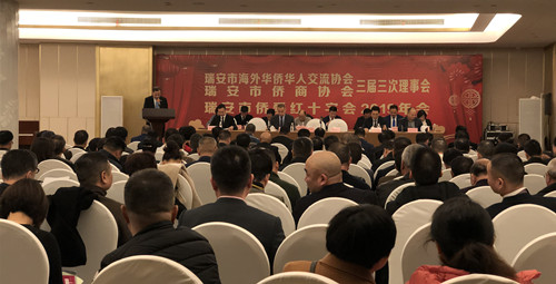日前,瑞安市海外华侨华人交流协会暨市侨商会三届三次理事会隆重举行,市委常委、统战部长项金敏,市人民政府副市长林增丰等市领导出席会议。参加会议的还有市侨商协会会长、市交流协会执行会长虞安林,市侨商协会名誉会长刘光华,市侨商协会监事长、市交流协会执行会长董邦云,市交流协会暨市侨商协会执行会长王云桧、蔡新土、李云鹏、朱良仕、黄麒麟以及市外侨办、镇街统战部门、侨务工作站等涉侨部门人士、协会会员共计150余位。