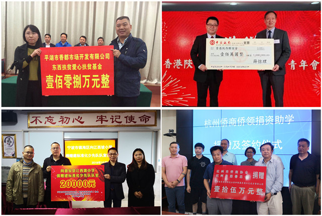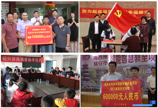 省侨商会监事长陈励君任董事长的浙江华日实业投资有限公司2018年10月向贵州省黔东南州锦屏县捐赠50万元人民币,帮助该县贫困群众脱贫;省侨商会首届科创委副主席李方平任董事长的浙江诺尔康神经电子科技股份有限公11月向四川省仪陇县捐赠价值100万元的诺尔康人工耳蜗,为该县贫困听障儿童重回有声世界;宁波市侨商会执行会长薛惊理4月向陕西省扶风县医护智创扶贫项目捐资51万元,用于该县中医院医护人员培训。12月,由他任董事长的康赛妮集团与陕西省榆林市相关部门和企业签订了发展绒山羊产业助推精准扶贫战略合作协议,计划未来3年内投入10~15亿元人民币,发展榆林地区绒山羊产业,为陕北人民脱贫致富作出贡献;嘉兴市侨商会常务副会长陈坚任董事长的平湖国际商品城、香都市场开发有限公司10月向四川省阿坝州捐赠用于贫困户脱贫致富的专项资金108万元,还和九寨沟县人民政府就设立经营进出口商品销售业务达成框架协议,计划投资1亿元项目资金助力九寨沟脱贫攻坚;杭州市侨商会、宁波市侨商会执行会长朱海宏等7位侨商、宁波市侨商会常务副会长相琼颖、丽水市常务副会长季方荣、宁波市侨商会副会长单位今正药业集团等分别向湖北省恩施州,贵州省普安县、黔西南州,陕西省石泉县,云南省等捐资,助力当地贫困群众脱贫致富。