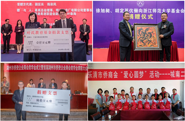 同时,众多会员还致力社会公益事业作出新贡献。省侨商会会长廖春荣任董事长的上海银润控股(集团)有限公司于2011年建立的银润慈善基金每年捐赠人民币200万元,用于改善老人生活条件,丰富老人精神文化生活,倡扬中华孝道传统;常务副会长丁列明任董事长的贝达药业股份有限公司积极承担社会责任,捐赠价值12亿元人民币的抗癌药品,用于贫困地区和困难家庭癌症患者治疗;副会长徐旭昶与夫人胡定英向浙江师范大学教育基金会捐赠价值100万元人民币的非洲名贵画作,支持浙师大非洲研究事业发展;副监事长方杰向湖北博物馆捐助50万元人民币,用于“曾侯乙墓出土四十年”研究;省侨商会顾问叶泰海去年捐资1000万元人民币,设立叶氏教育基金,助力家乡教育事业;温州市华商会向文成县台风受灾群众捐赠30万元,帮助重建家园。还捐资12多万元开展“健康光明行”爱心活动,为文成、泰顺、苍南等地白内障患者提供免费复明手术;湖州市侨商会成立公益教育基金,其中60万元人民币用于支持当地教育事业;省侨商会科创委委员单位恒勃控股股份有限公司热心社会慈善事业,捐赠45万元用于敬老院、老人协会建设及帮扶困难留守儿童等。杭州、宁波、嘉兴、绍兴、金华、衢州、舟山、台州、丽水和余杭、乐清、永嘉、瑞安、柯桥等市、县(市、区)侨商会都开展了扶贫及捐赠慈善和教育、文化、卫生等爱心活动。