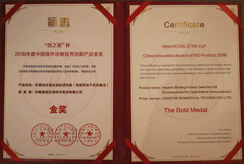 近日,“创之星”杯中国体外诊断优秀创新产品颁奖典礼在南昌绿地国际会议中心举行,中翰盛泰自主研发的独家产品“肝素结合蛋白(HBP)测定试剂盒(荧光免疫法)”荣获创新产品试剂类金奖。