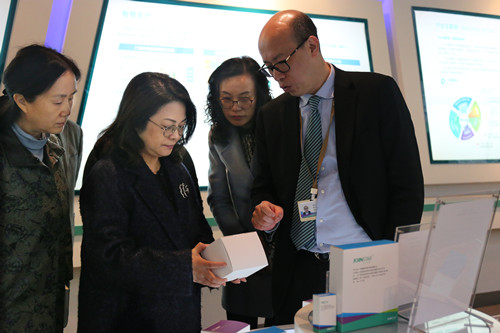 吴晶一行在周旭一董事长的陪同下参观了公司展厅,周旭一董事长汇报了公司最近几年的发展情况,重点介绍公司创新产品JS3000系列及国际首创、国内独家、可提前72小时预测脓毒症发作的肝素结合蛋白(HBP)检测试剂盒等;随后在公司党委书记刘伟的陪同下参观了党群文化中心。
