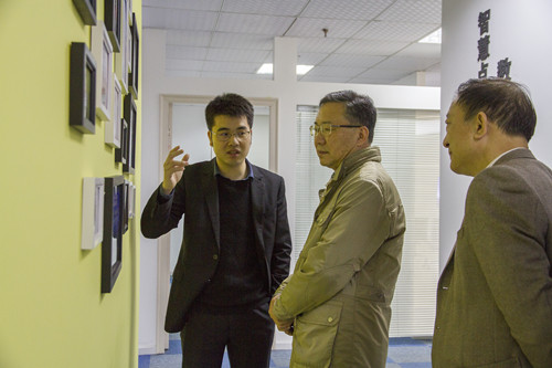 王真震董事长(左)向舟山市政协忻海平副主席(中)、市政协常委詹志军(右)介绍华量软件公司情况