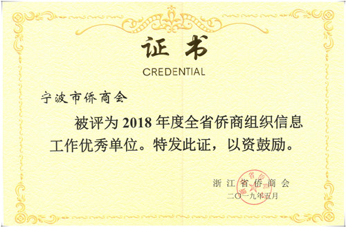培训班上,浙江省侨商会表彰了全省侨商组织2018年信息工作优秀单位和优秀通讯员,宁波市侨商会再获全省侨商组织信息工作优秀单位称号,这已经是宁波市侨商会连续四年获得该称号,信息员鲁冠芬再获优秀通讯员称号。