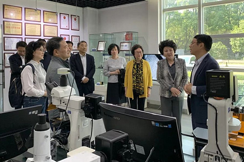 裘援平一行参观了永新光学产品陈列室、新厂房沙盘和国家重点研发计划重点专项《高分辨荧光显微成像仪》样机展示厅。毛磊介绍了企业科技创新成果、产品及新厂房建设进展和未来发展规划等相关情况。