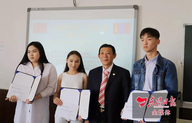 在助学颁奖仪式上,蒙古国东阳商会向三位获奖学生每人颁发3000元人民币等值奖学金、奖励证书。金锦明代表东阳商会致词时表示:“长期以来,在蒙东阳籍企业以中蒙文化教育基金会为平台,积极践行社会公益,为发展蒙古经济、促进经贸发展和人文交流贡献力量。选择在蒙中友谊学校设立奖学金,目的在于共同为蒙古国的汉语教育贡献力量,为中蒙友好培养栋梁之材”。