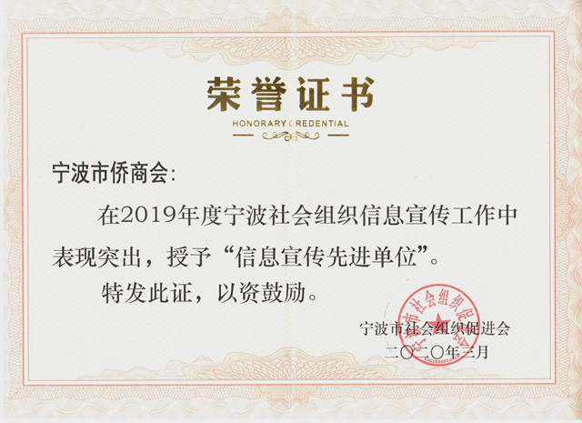 宁波市侨商会再次被评为“2019年度信息宣传先进单位”称号,信息员鲁冠芬再获“2019年度优秀通讯员”称号。
