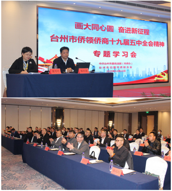 12月11日,为深入学习贯彻党的十九届五中全会精神,台州市委统战部(侨办)、市侨联联合举办“画大同心圆 奋进新征程”台州市侨领侨商代表十九届五中全会精神专题学习会。会议由台州市委统战部副部长、市侨办主任陈庆进主讲,台州市侨联副主席、市侨商会常务副会长黄巧巧主持。台州市侨商会会长林文清,常务副会长辛建树、吴辉、颜芩、颜玲富、李选,副会长阮春晖、李建国、张瑛、金云中、贺云富、徐孔森、徐定伟、詹小远等28位受邀参加。