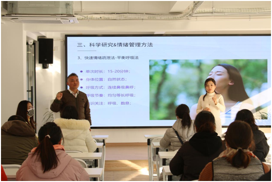 众康联集团方工作人员此前就了解到,此次的学员们大都来自基层社区,他们的日常工作繁多且要求细致,个人心里积累的压力都不小。于是,李鹏老师和陈怀民老师一同为大家分享了真实有效的压力释放方法——321呼吸法。
