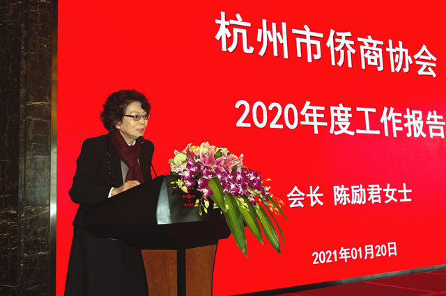 市侨商会会长陈励君作工作报告。她指出,2020年是商会非常之年,面对复杂多变的国际形势,在新冠病毒肆虐的影响下,在全体会员企业的共同努力下,始终不忘初心、用心聚侨、为侨服务的宗旨,以同心同德、无私大爱精神和勇于担当的践行,在大疫之年谱写出杭州侨商的新篇章;组织会员企业捐款捐物,抗击新冠肺炎疫情、助力企业复工复产;组织参与各类会务活动,结合文化建设、注重储备青年人才为主线,强化组织建设为指导,在上级领导支持关心下,商会和会员企业成绩显著。去年商会工作实践证明,杭州侨商是一支勇于担当、不畏艰难、勇往直前的队伍,是侨的骄傲,杭州的骄傲。今年是我国现代化建设进程中具有特殊重要性的一年。商会要坚持新发展理念,构建新发展格局,抓住机遇,奋发努力,敢于担当,以习近平新时代中国特色社会主义思想为指导,全面贯彻党的十九大和十九届二中、三中、四中、五中全会精神,在杭州市委、市政府和市委统战部的领导下,在有关部门的支持与关心下,取得新的成绩。