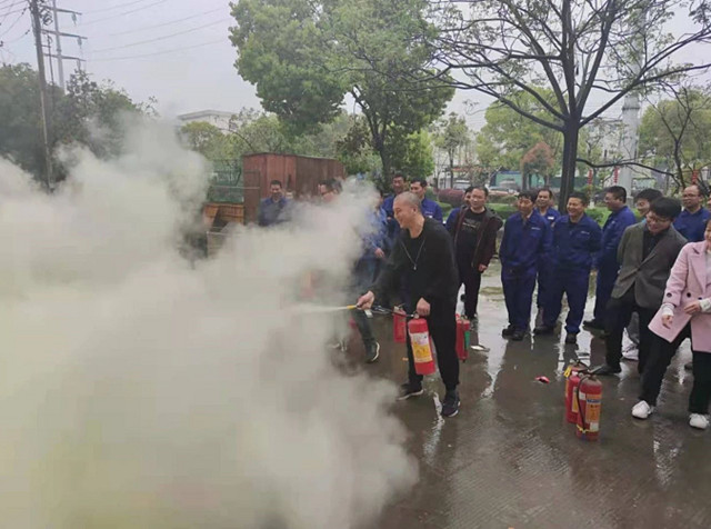 会后,在张福祥的指导下,全体员工在室外空地进行了(干粉)灭火器消防灭火实地演练。