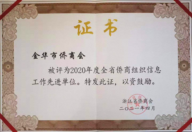 4月27日至28日,2021年全省侨商组织信息宣传培训班在温州乐清举办。培训班上,浙江省侨商会表彰了2020年度全省侨商组织信息工作先进单位,金华市侨商会名列其中,秘书长成盖平作先进典型发言。至此,金华市侨商会已连续五年获此殊荣。