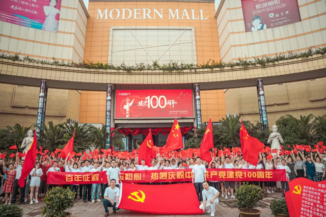 最近,由宁波市侨商会副会长单位、宁波伟立投资集团有限公司党委主办,现代商圈党总支协办的现代商城商圈庆祝建党100周年活动在现代商城隆重举行,在场党员和群众为党的生日献礼,把最美的歌声、最深情的祝福献给党。