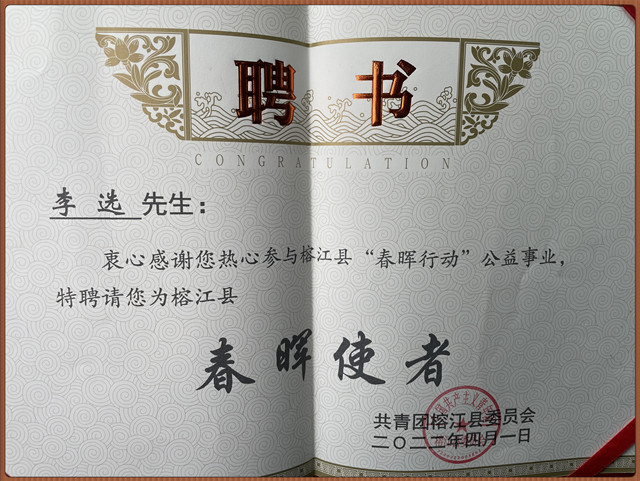 浙江省侨商会青委会副主席、杭州三元电缆有限公司总经理李选,于近日分别被贵州省榕江县、从江县特聘为春晖使者。他从2012年至今循环认领结对贵州省榕江县、从江县等多名学生,目前还有11名学生在结对中,结对对象从小学到大学,且多次每年冬天都参与暖冬行动,捐助多个学校学生三件套冬季校服、运动鞋和带绒雨鞋等,传递温暖和希望,使更多的贫困学子们受到资助,能让他们在学校好好学习,坚定理想信念,传承爱心,将来做一个对国家对社会有贡献的人。