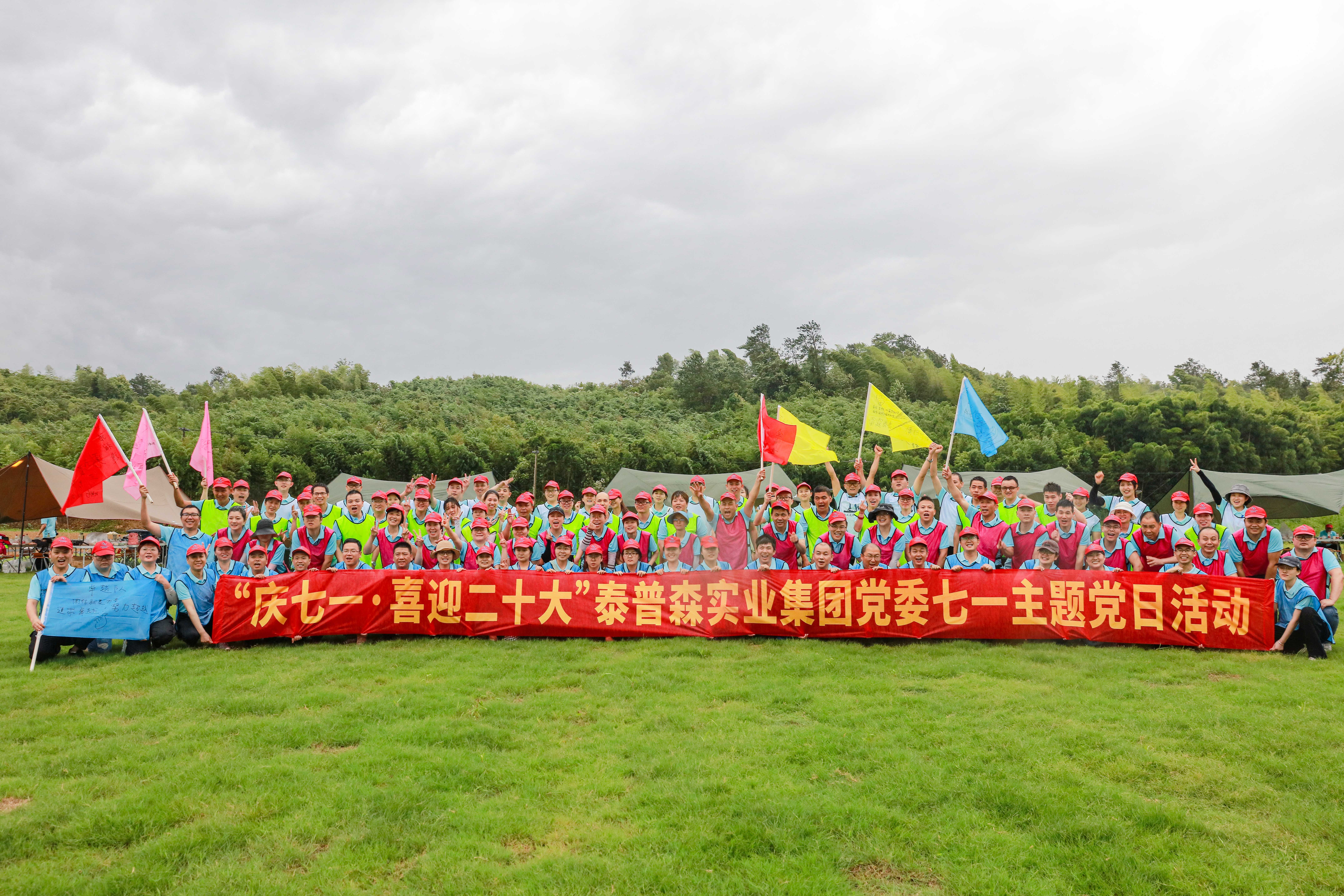 回到基地后,所有党员面对党旗,重温入党誓词。随即,户外团队拓展熔炼活动在象月湖萤火草坪拉开序幕。此时,雨越下越大,但依旧阻挡不了泰普森党员们的热情,大家团结协作,不畏风雨完成了所有的活动项目。