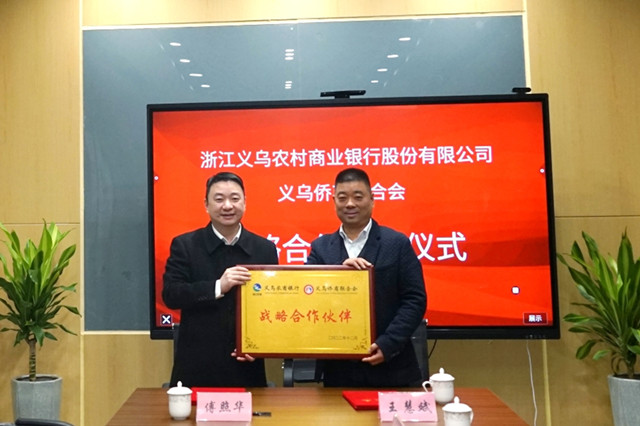 12月13日,义乌侨商联合会与义乌农商银行举行了战略合作签约仪式,双方就资金结算、企业投融资、推荐会员客户等各自优势资源互补方面达成合作协议。义乌农商银行向义乌侨商联合会提供10亿元人民币的综合授信额度贷款,全力支持义乌侨商联合会及其成员单位金融服务需求。浙江省侨商会常务理事、义乌侨商联合会会长王慧斌与义乌农商银行行长傅照华互签合作协议。