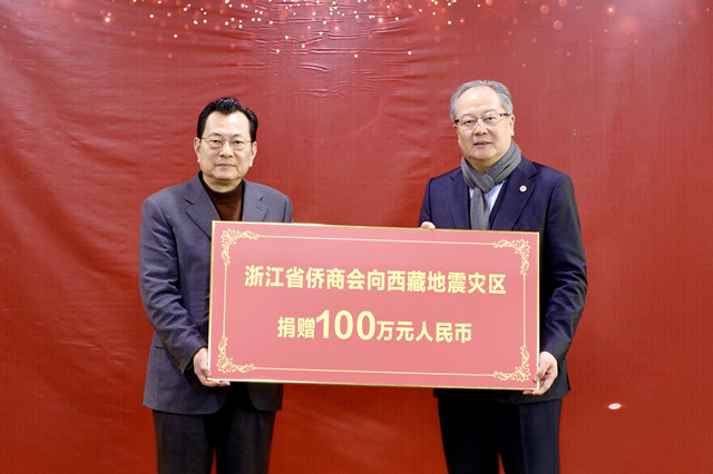 八、履行社会责任,捐助西藏地震灾区群众恢复生产、重建家园。1月7日,西藏自治区日喀则市定日县发生6.8级地震,造成重大人员伤亡,大量房屋倒塌。这场特大地震灾害牵动着全国人民的心,也牵动着浙江广大侨商的心。1月12日,浙江省侨商会通过省慈善联合总会向地震灾区捐款100万元人民币,以表达浙江侨商的一片爱心。