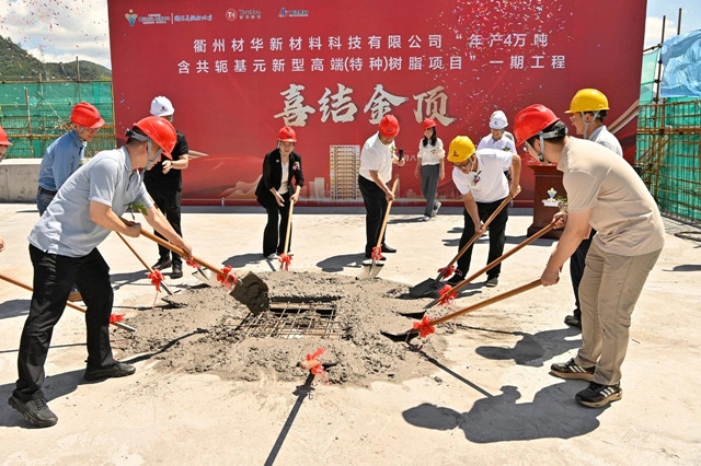 8月8日,绍兴市柯桥区侨商协会副会长单位浙江材华科技有限公司全资子公司——衢州材华新材料科技有限公司的“年产4万吨含共轭基元新型高端(特种)树脂项目”一期工程封顶仪式在项目建设现场举行。