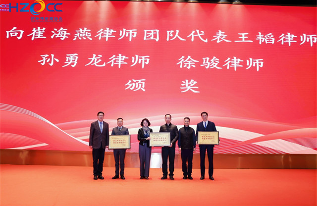 会议举行表彰仪式,监事长、维权委员会主任方杰宣读了表彰决定,授予崔海燕律师团队、孙勇龙律师与徐骏律师“依法护侨彰正义,倾情为侨暖侨心”荣誉称号,并颁发了奖牌与证书。
