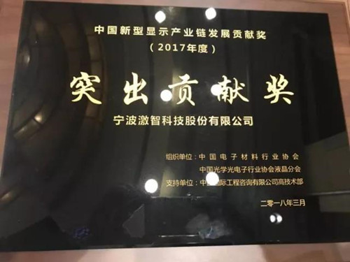本次“中国新型显示产业链发展贡献奖”设立“协同开发”、“卓越贡献”、“突出贡献”及“特殊贡献”四个奖项。宁波激智科技股份有限公司的“TFT-LCD液晶显示用光学扩散膜的研发与产业化”项目获得了专家评委的高度肯定,荣获2017年度“中国显示产业链突出贡献奖”,以表彰激智科技为持续增强中国面板产业链国产化配套能力所作出的不懈努力和卓越贡献。
