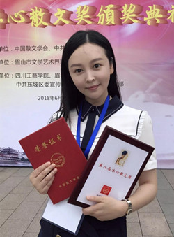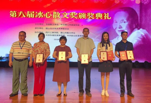 6月23日,第八届“冰心散文奖”在苏东坡故里四川眉山举行颁奖仪式。金华市侨商会文学顾问、中国网络作家村作家胡毅萍荣膺本屇冰心散文奖殊荣。据悉,共有4位浙江籍作家获得本届冰心散文奖。中国散文高峰论坛也同时举办。