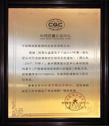 9月6日,中国质量认证中心护卫者品牌发布会在上海举行,会议期间由中国质量认证中心为《户用屋顶光伏系统认证规范》作标准解读。此次认证规范是根据《国家认监委关于下达2017年第一批认证认可行业标准制定计划项目的通知》(国认科【2017】70号),由中国质量认证中心承担的国内首个《户用屋顶光伏系统认证规范》获批立项,宁波侨企锦浪科技作为该标准的主要起草单位,获得认可,并被授予奖牌。