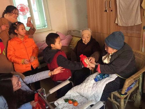 志愿者们拉着老人的手话家常,让老人们倍感温暖。在活动中,5位小朋友还为老人们送上了《新年好》、《国旗、国旗》等歌曲。听完小朋友的表演,88岁的老奶奶情不自禁地表演起了《白毛女》、《十八里相送》等经典戏曲,大家把最热烈的掌声送给老奶奶。