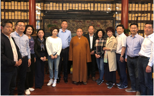 少林寺方丈释永信大师(左七)与舟山市侨商会会长陶性于(左六)等合影
